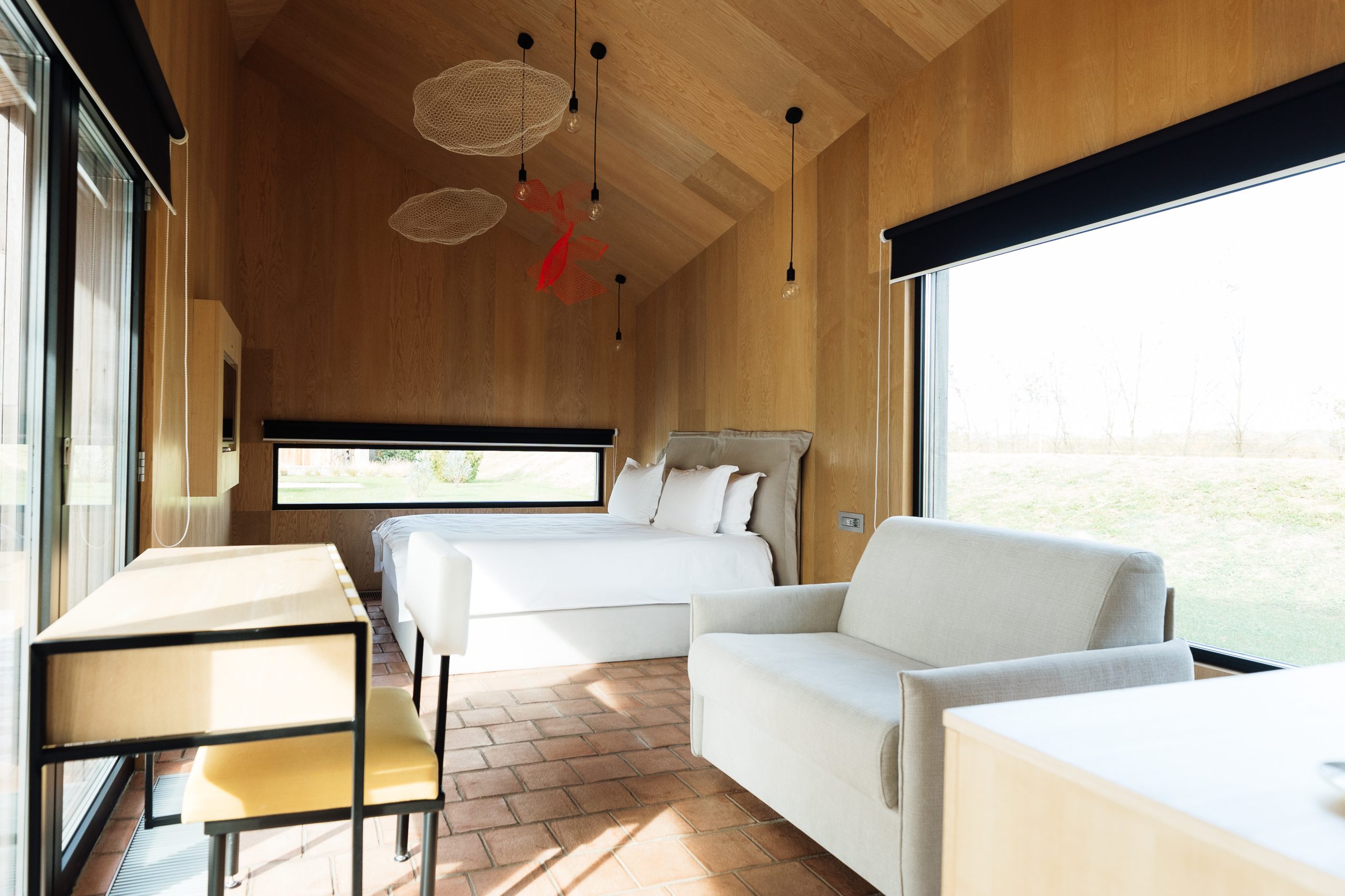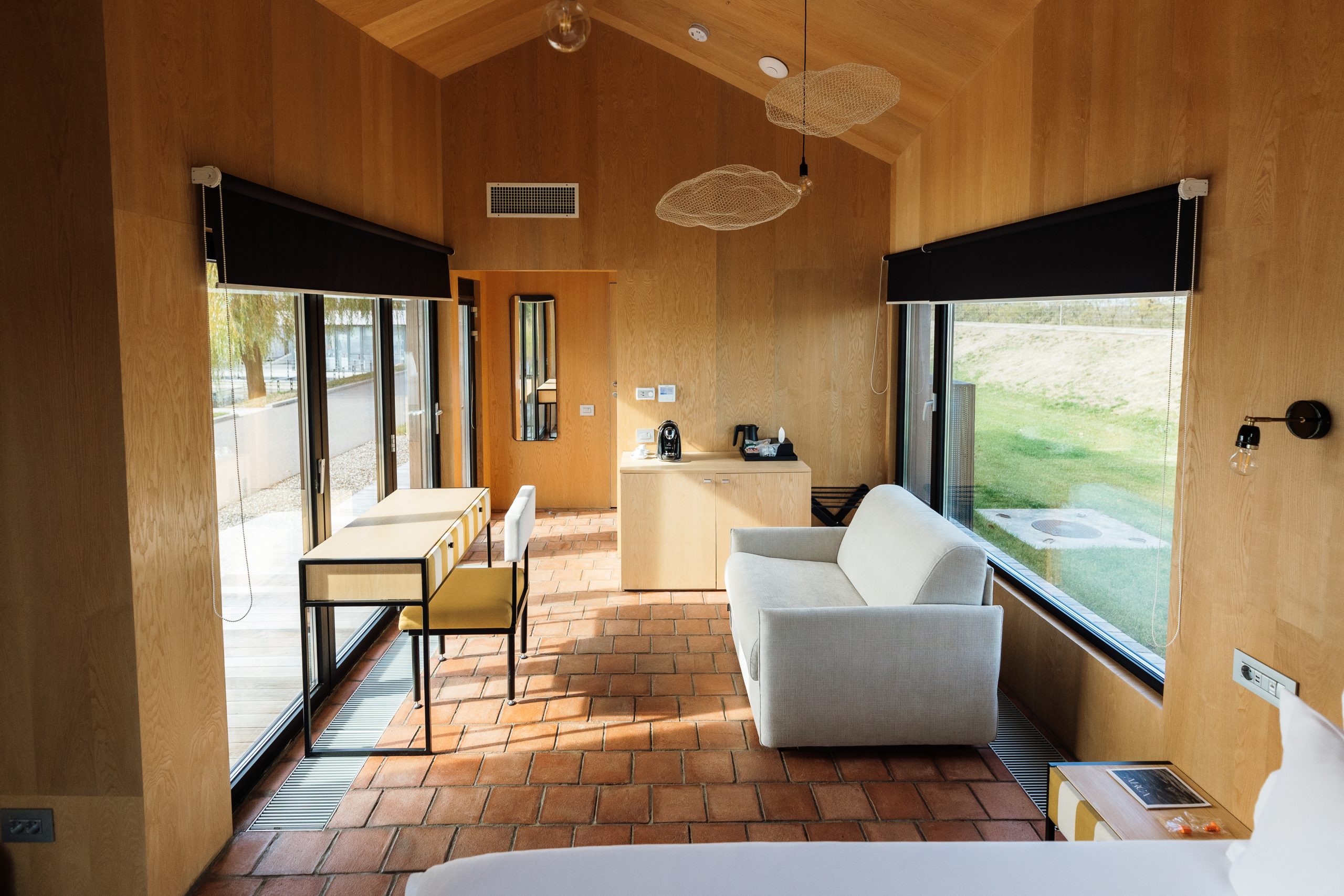 Interiorul păstrează același stil cald și simplu al căsuțelor ARCA, cu mobilier minimalist ales cu grijă și spațiu suficient pentru a te mișca în voie și a te simți cu adevărat „acasă”. Ferestrele largi aduc aproape peisajul din jur, iar priveliștea către natură completează senzația de relaxare deplină.